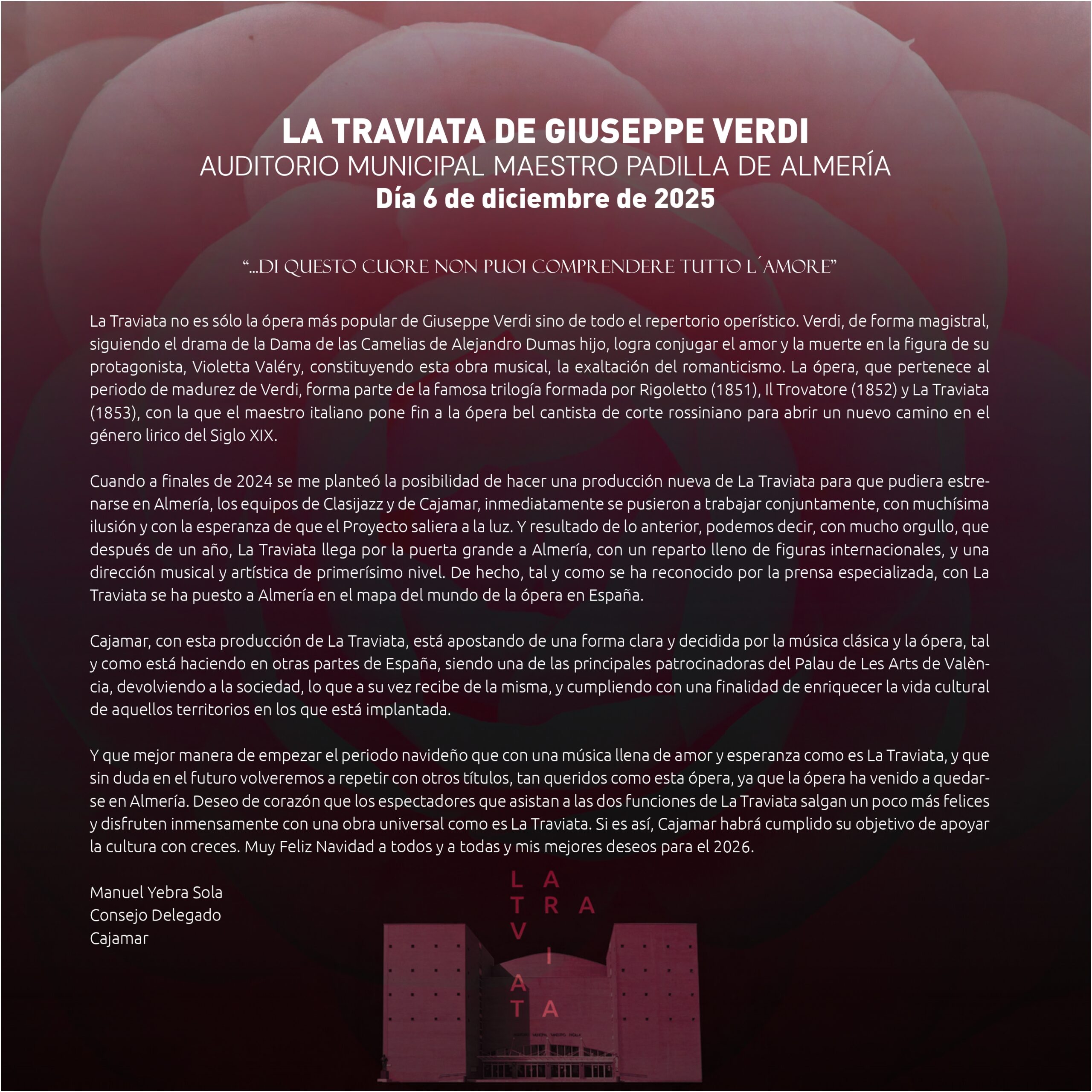 y disfruten inmensamente con una obra universal como es La Traviata. Si es así, Cajamar habrá cumplido su objetivo de apoyar la cultura con creces. Muy Feliz Navidad a todos y a todas y mis mejores deseos para el 2026.